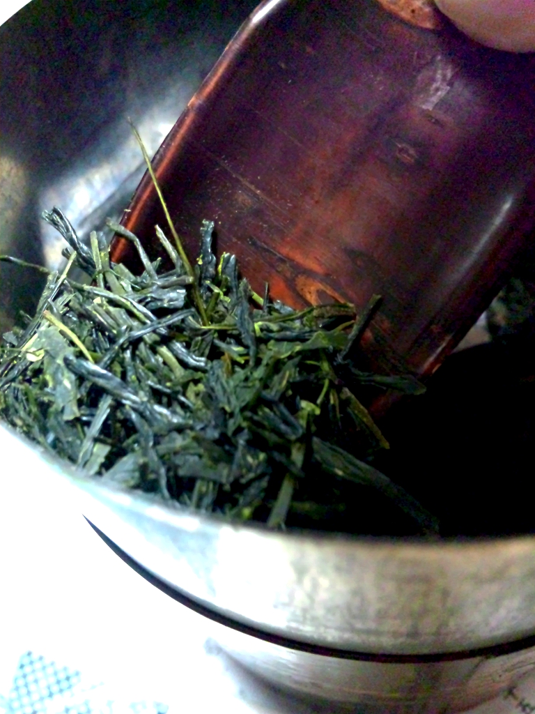 お煎茶なので、急須(うちはティーポットを流用していますが…)に入れたお湯を一度お湯呑に移し、急須に茶葉を入れて、お湯呑のお湯を急須に戻す方式。