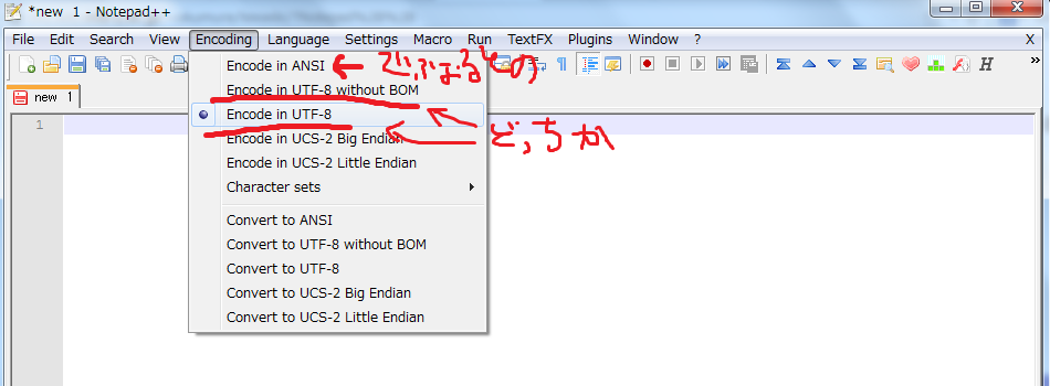 でもNotepad++側でUnicodeにしないと日本語コメントがしんじゃう…