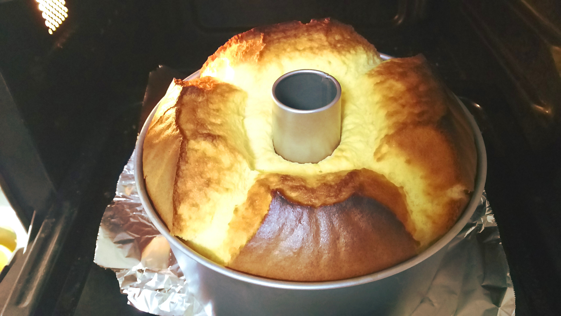 シフォンケーキってうまくふくらまなくて難しいイメージがあったのですが、ちゃんとふっくらふくれあがってきれいな割れ目ができました。焼き上がりが割れるくらいがよいらしい。
