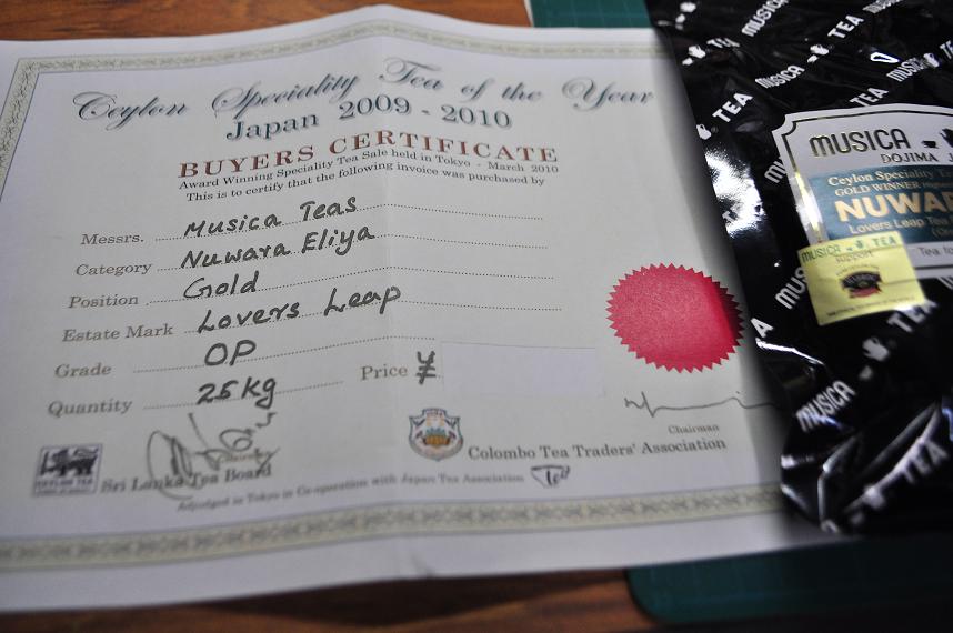 日本で初めてヌワラエリヤを輸入したというムジカティーは、ヌワラエリヤ地域で最高値で落札した証である金賞を受賞!
