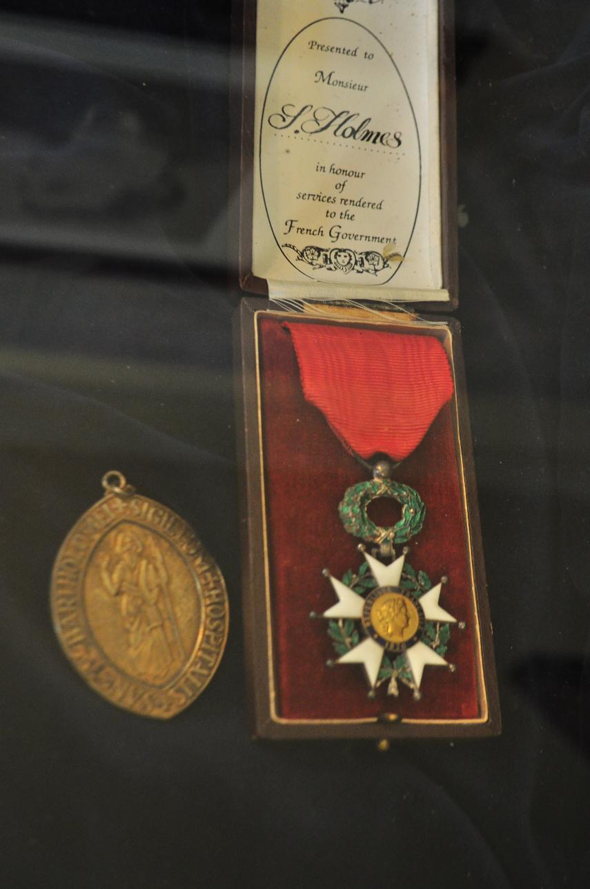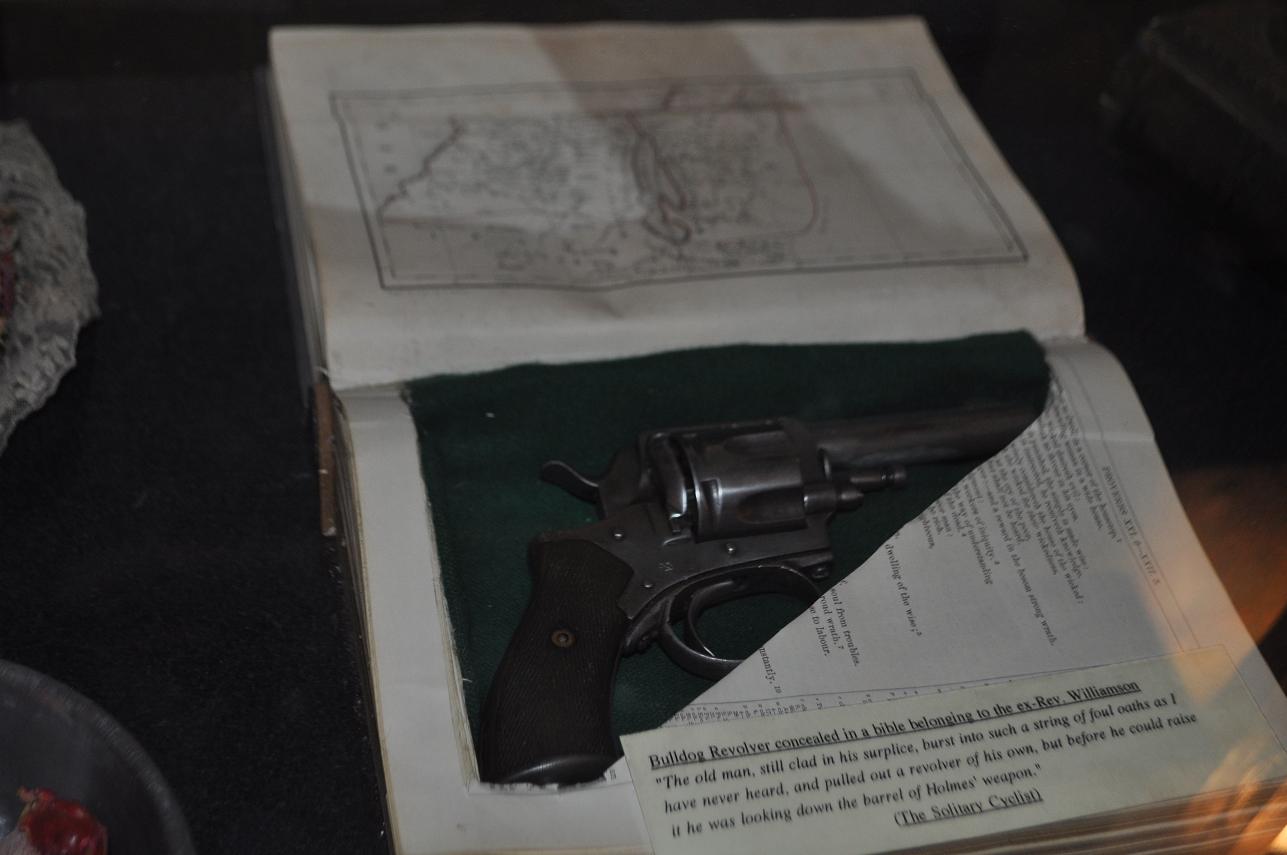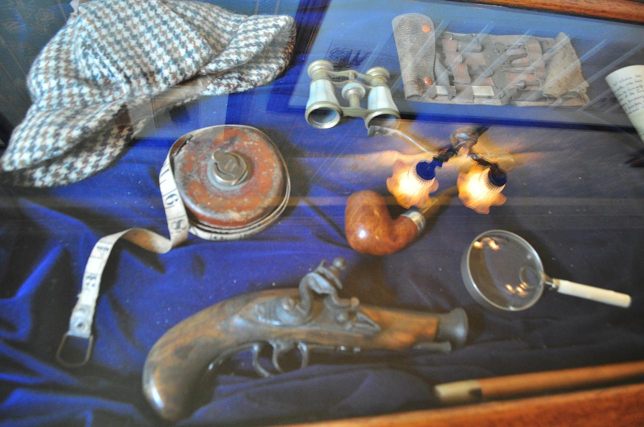 隣の陳列棚には、ホームズ7つ道具っぽいものとか収めてある。