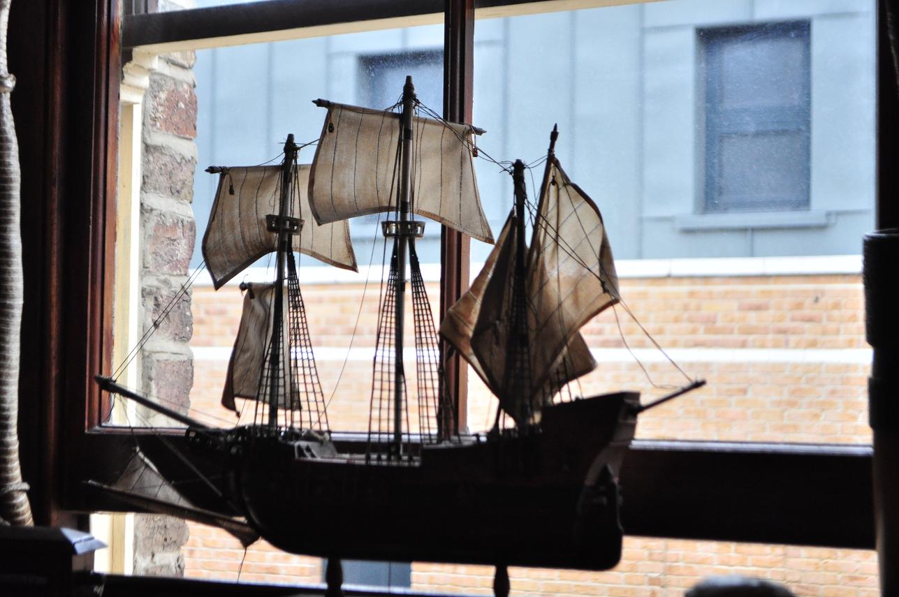 窓際に帆船模型。