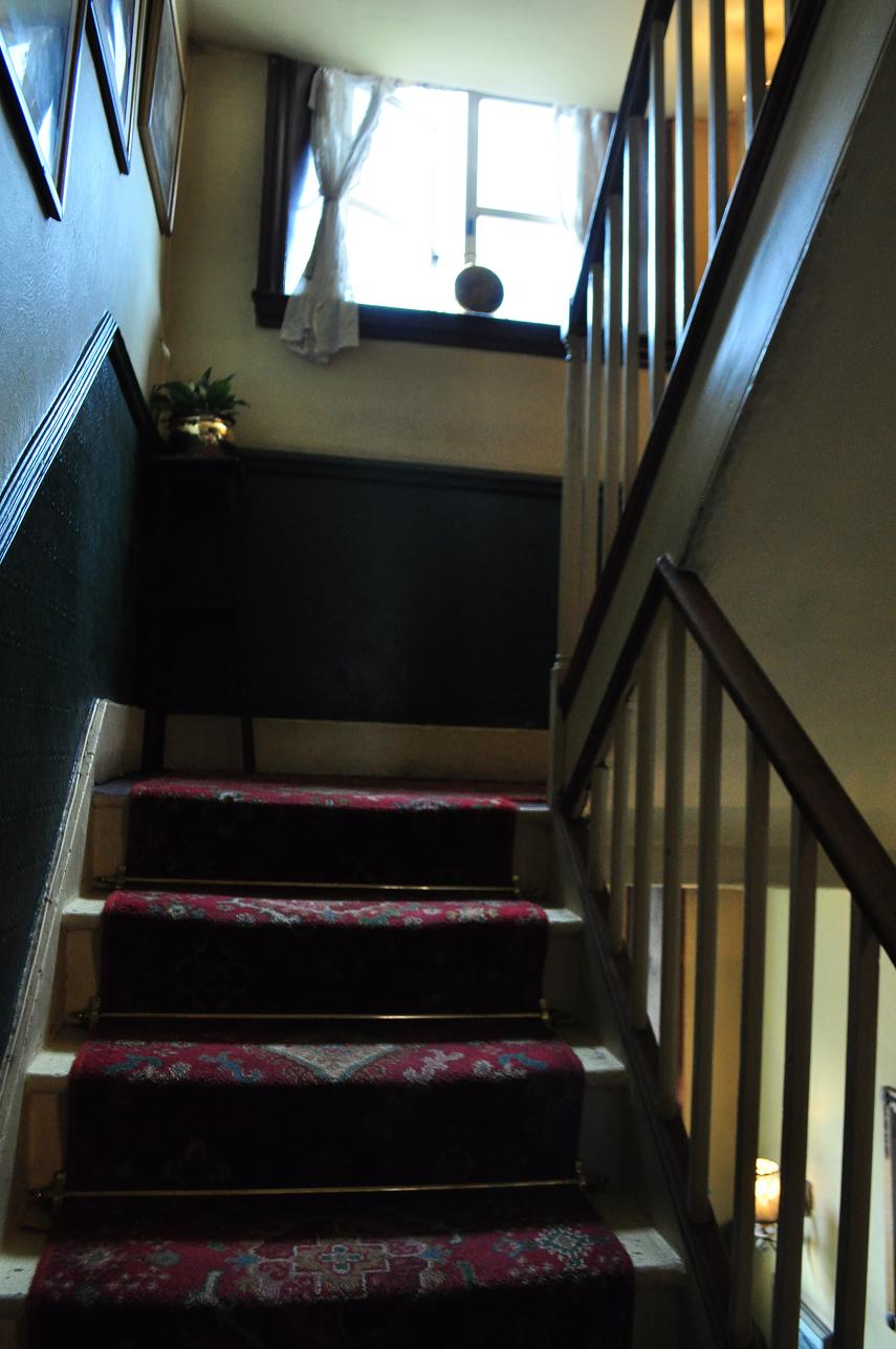 そんなかんじにオブジェクトぎっしりの部屋から出て、せまい階段をのぼる。