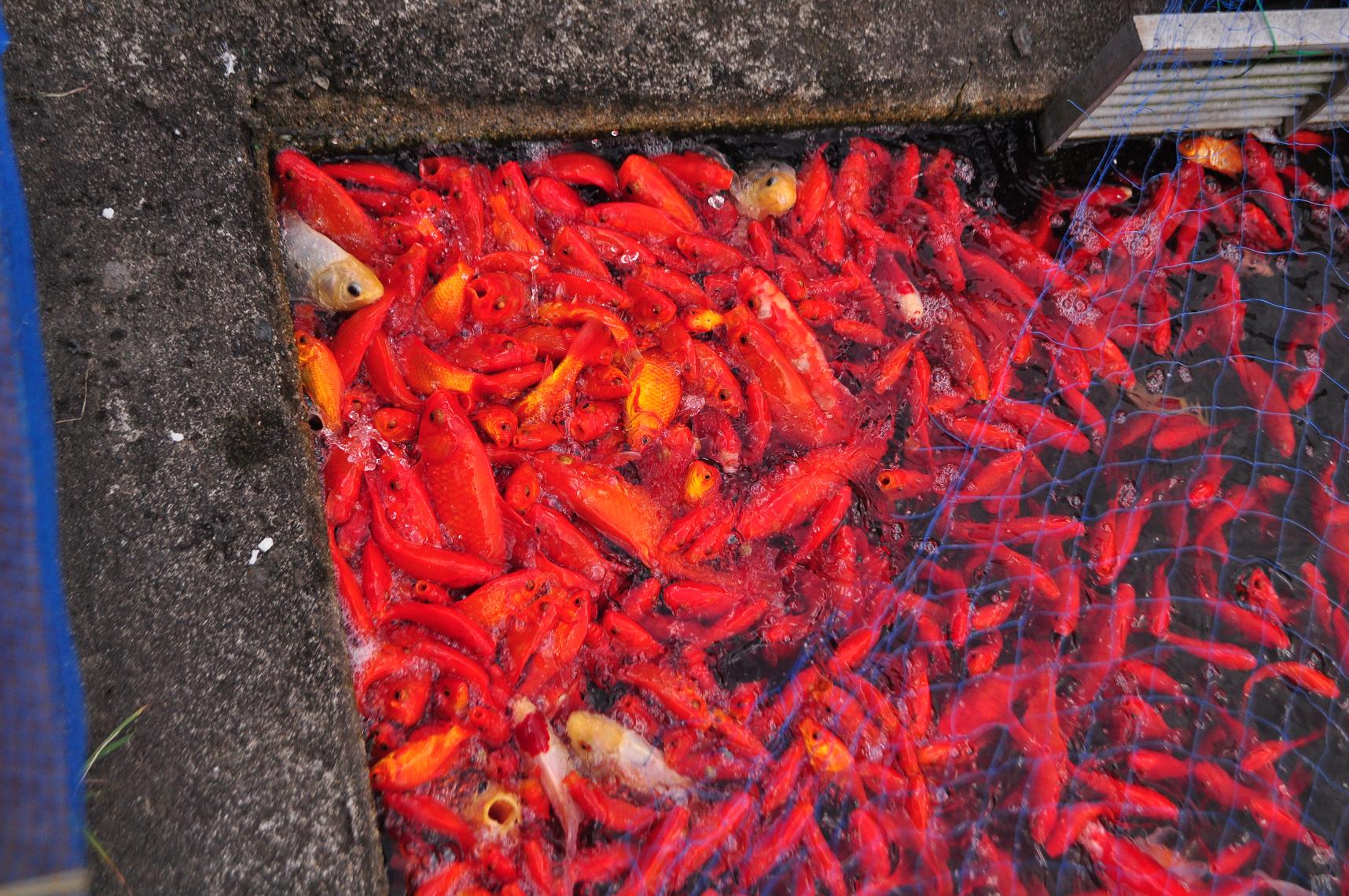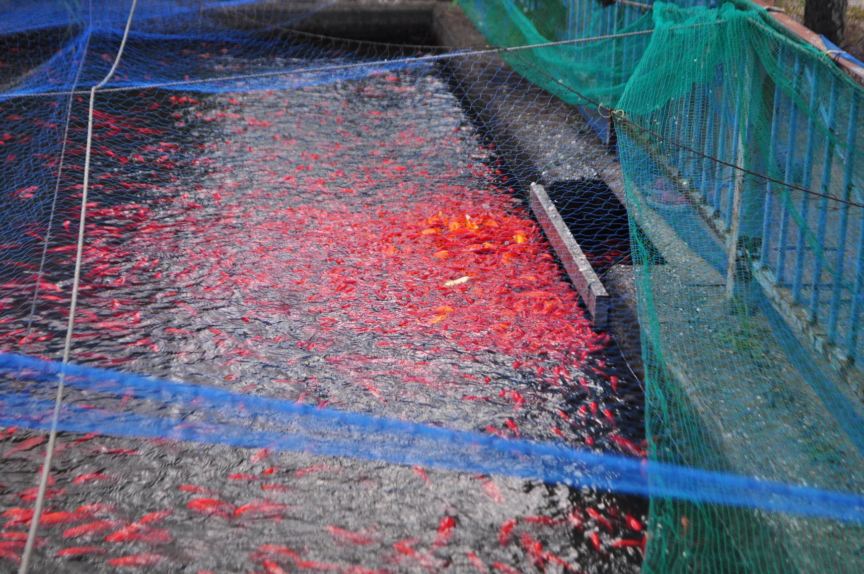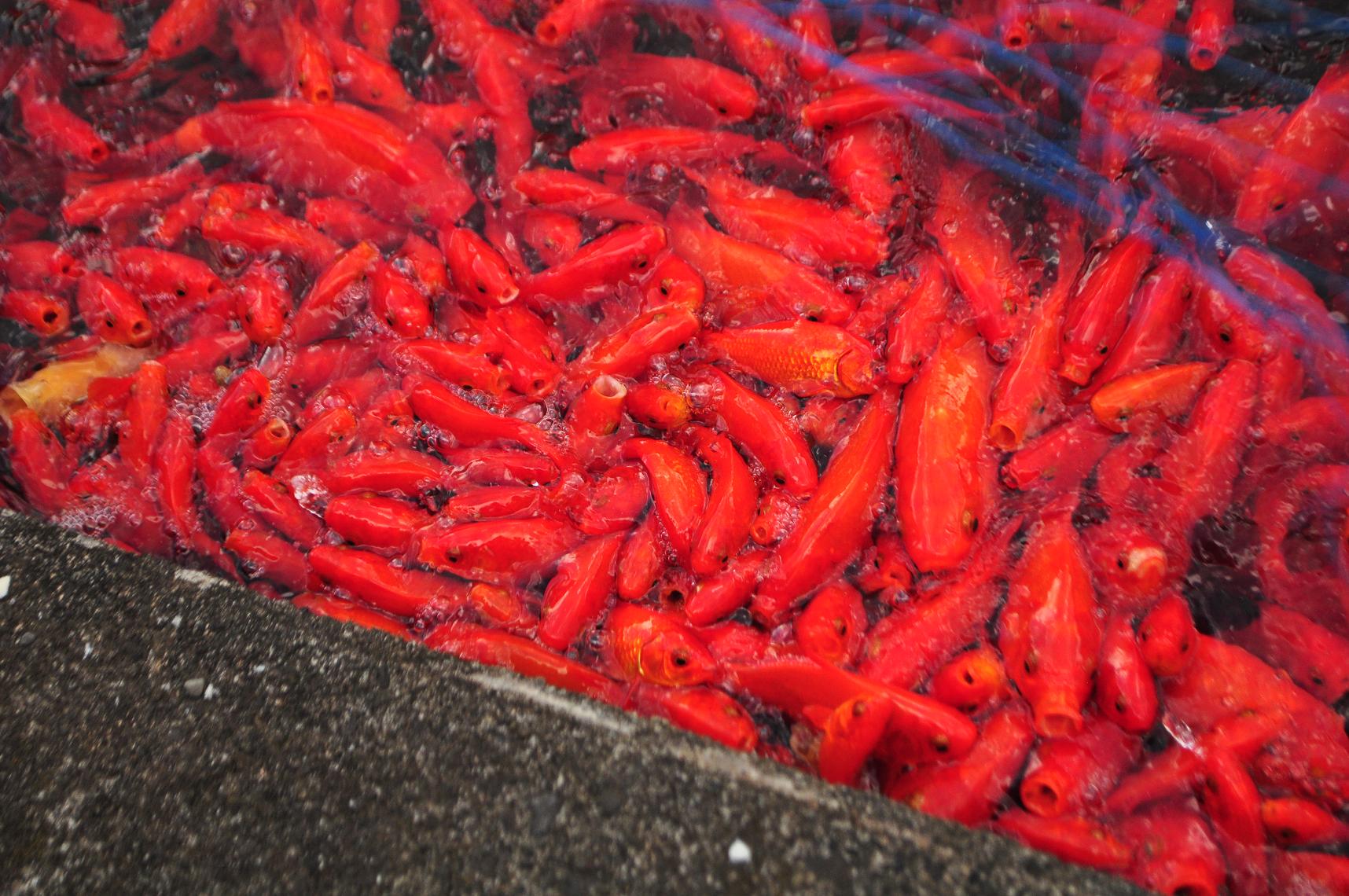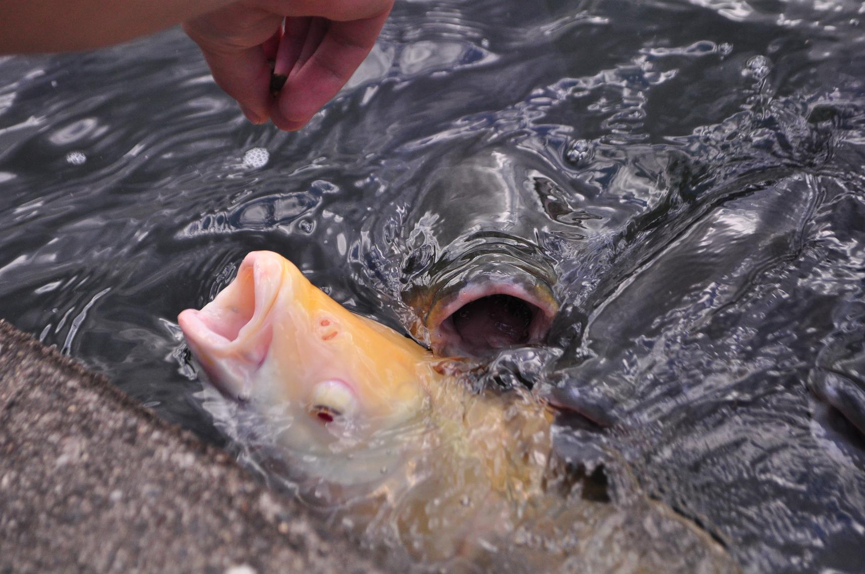 家庭スケールではない、南郷水産センターのアトラクションとしての金魚のえさやりをご覧あれ。