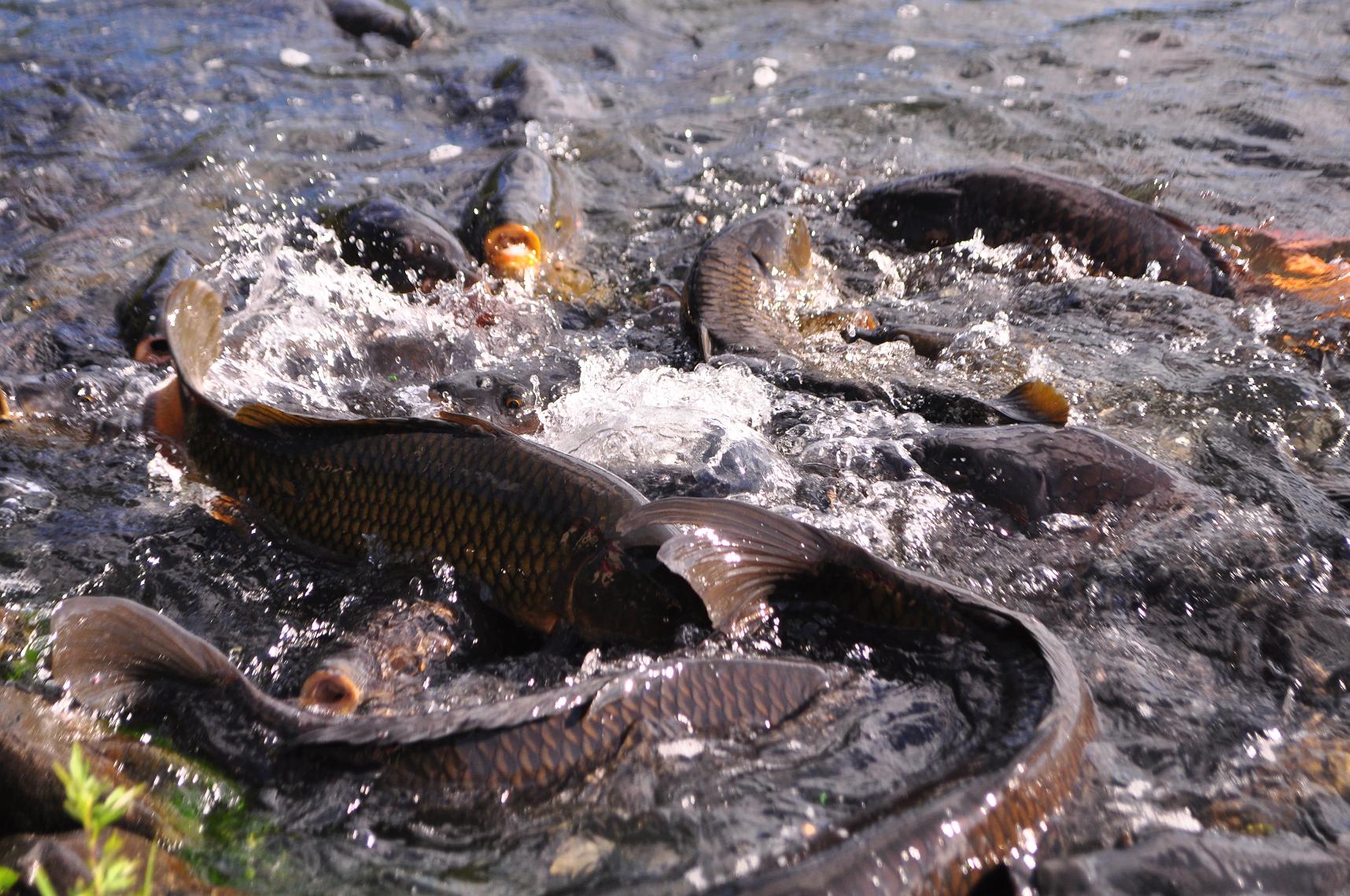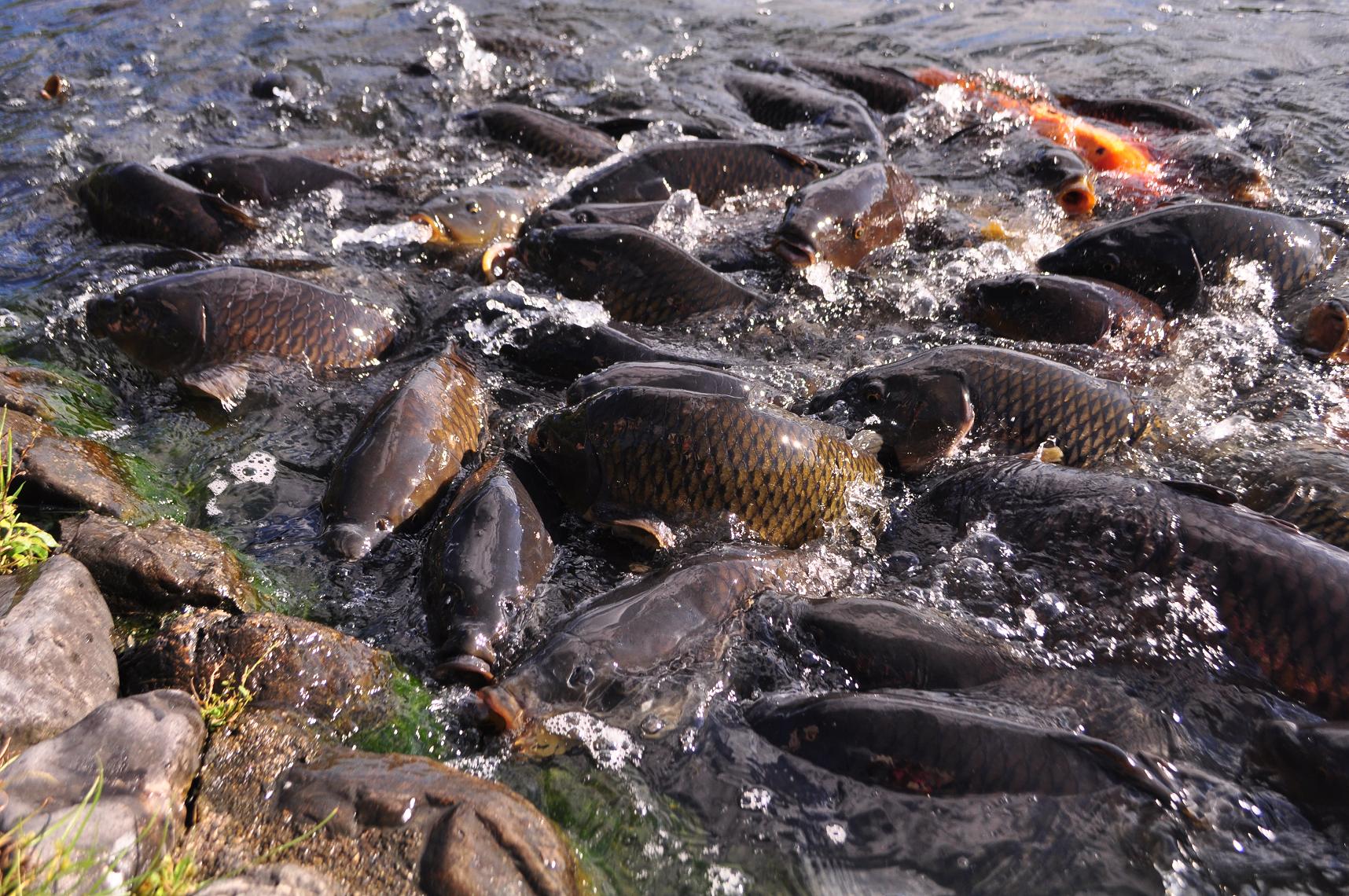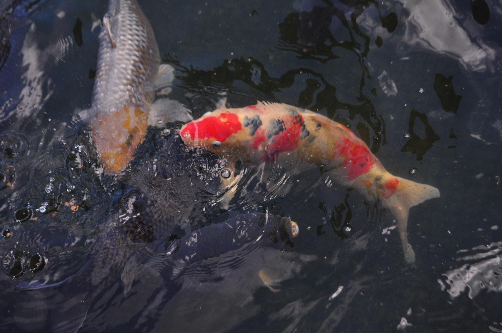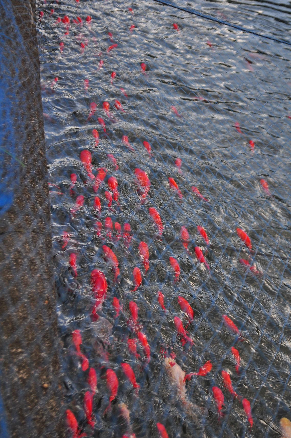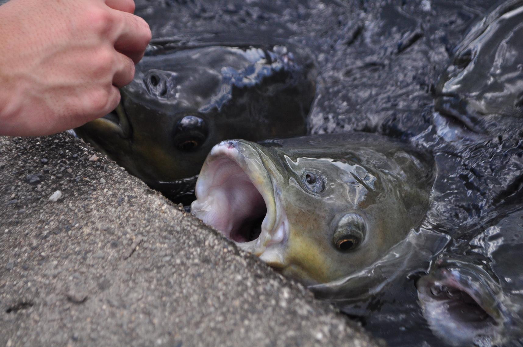 家庭スケールではない、南郷水産センターのアトラクションとしての金魚のえさやりをご覧あれ。
