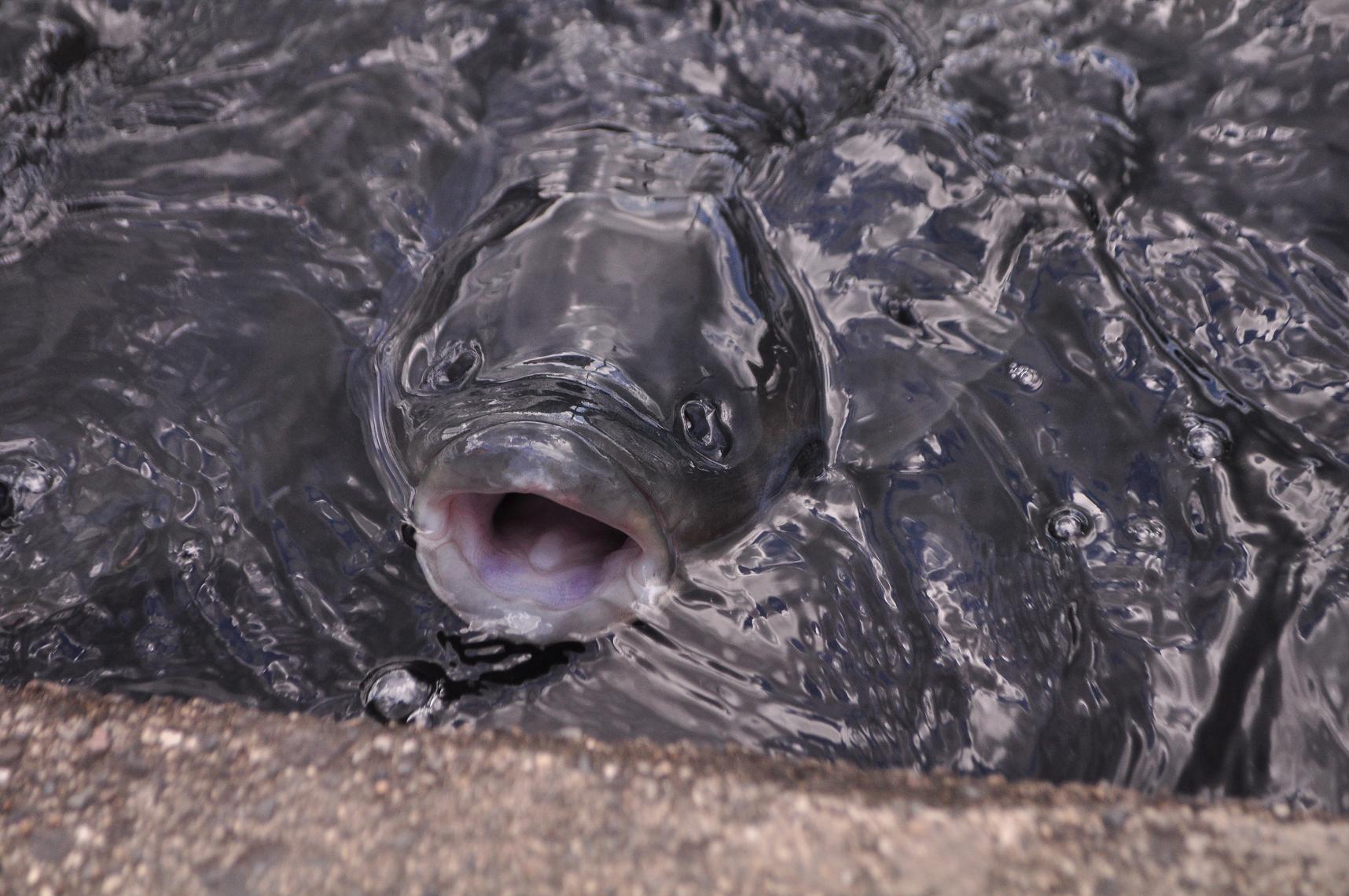 南郷水産センターでは、「魚のえさやり」で魚とふれあえるんですよー!