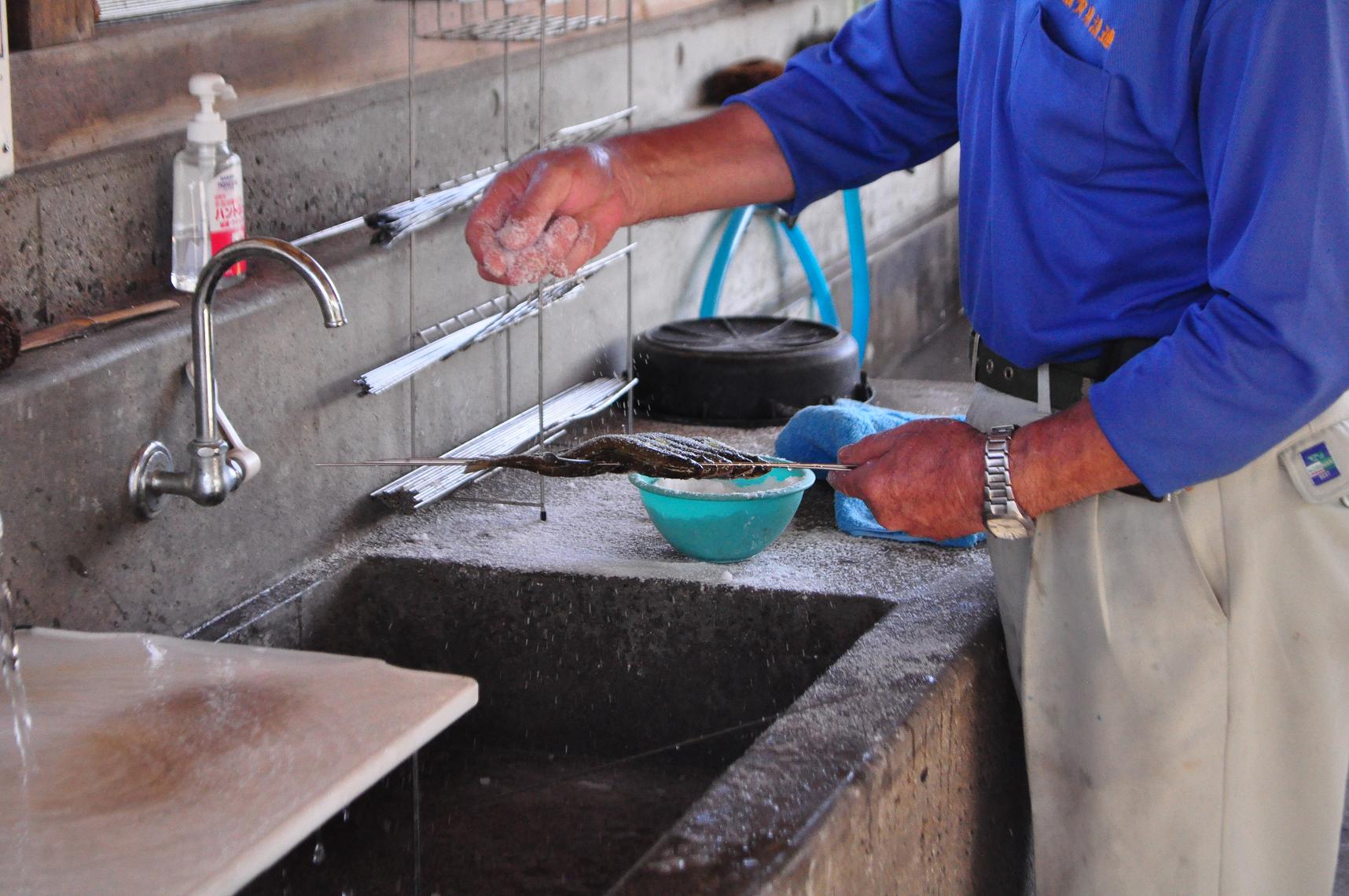 各個体の串が通ったあとは、6匹まとめる串も刺す。