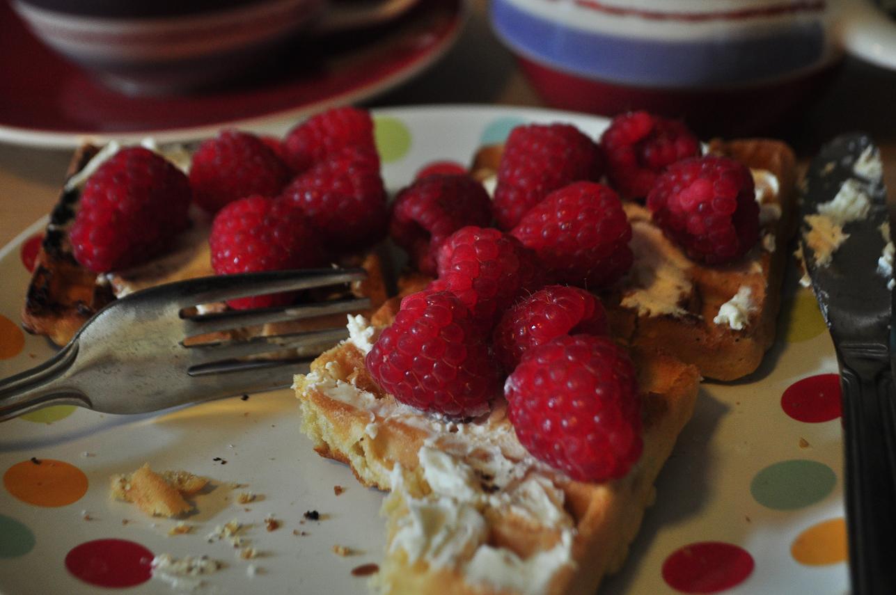ラズベリーの甘酸っぱさがかりっと焼いたワッフルのアクセントになってなかなかよし。